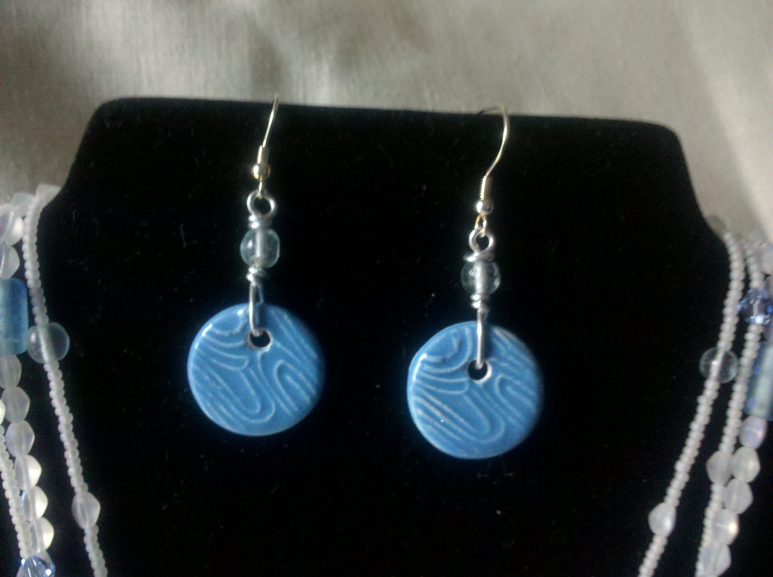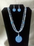 Here is a set that I had envisioned for quite some time, but finally created it. The necklace holds ceramic blue pendant hands from three strands of glass and crystal beads with seed beads. Matching blue earrings, of course. I just love the feel of the cool ceramic pendant.